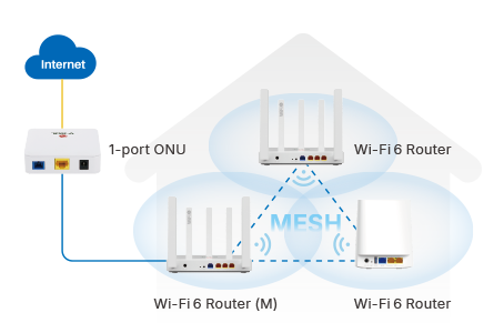 通过紧凑型单口 ONU 与 Wi-Fi 6 Mesh 路由器组合,实现灵活可扩展的 FTTH 部署方案,适用于家庭及中小企业环境。