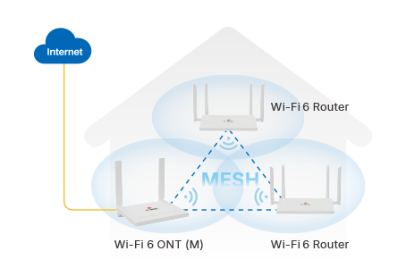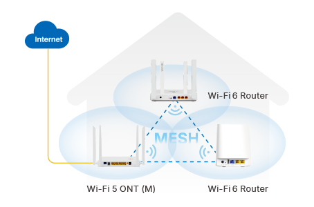 面向已有网络的升级需求,将现有 Wi-Fi 5 ONT 与 Wi-Fi 6 Mesh 路由器组合使用,在无需更换接入设备的情况下提升无线性能与覆盖能力。
