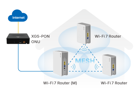 面向新一代 FTTH 网络部署,将 XGS-PON ONU 与 Wi-Fi 7 Mesh 路由器结合,提供超高带宽接入能力与全屋无缝无线覆盖,适用于高端宽带场景。