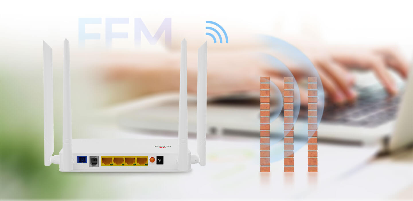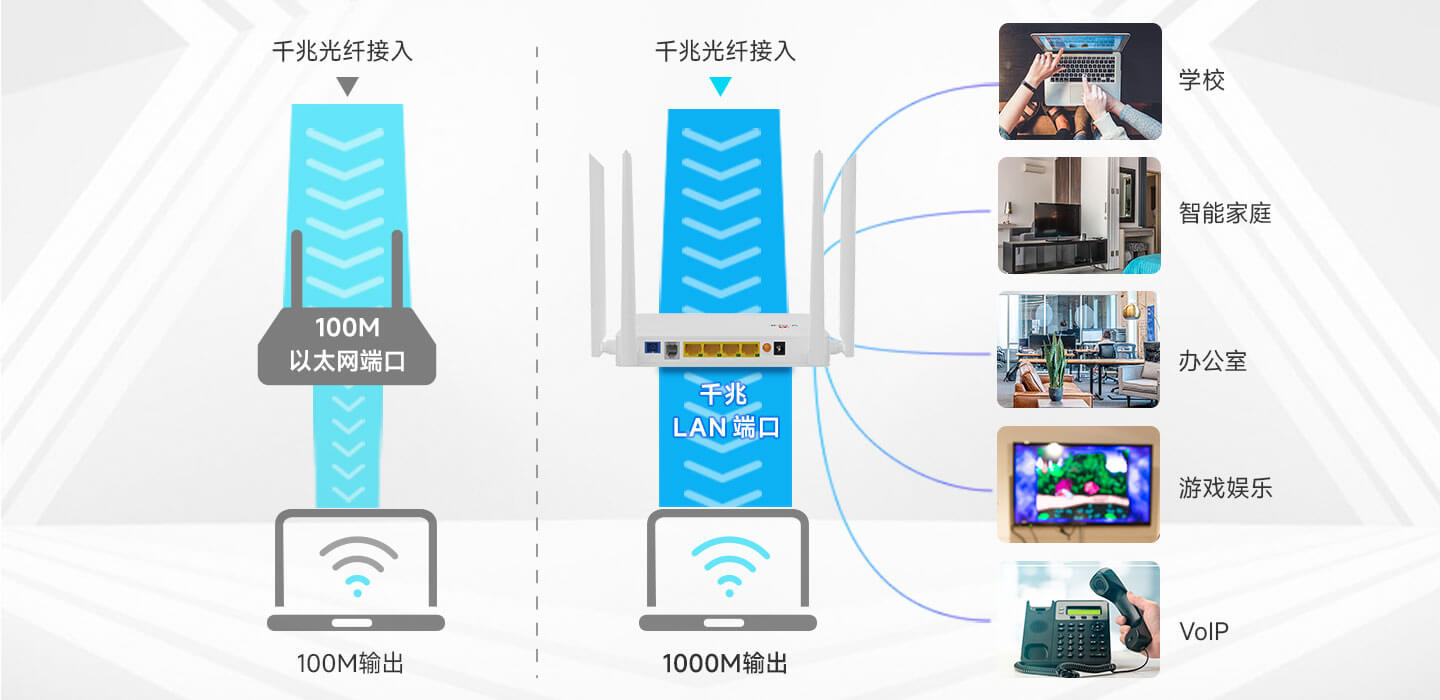 配备4个千兆网口,XPON自适配。外挂 FEM,Wi-Fi 多穿一堵墙!