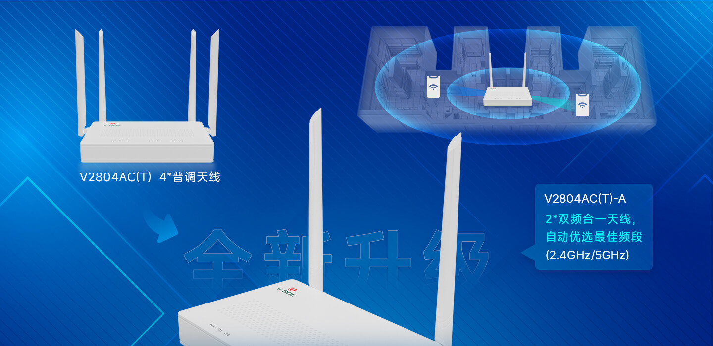 外置2根2.4GHz/5GHz双频天线,精简设计降低成本。统一SSID智能切换,重塑网络体验。