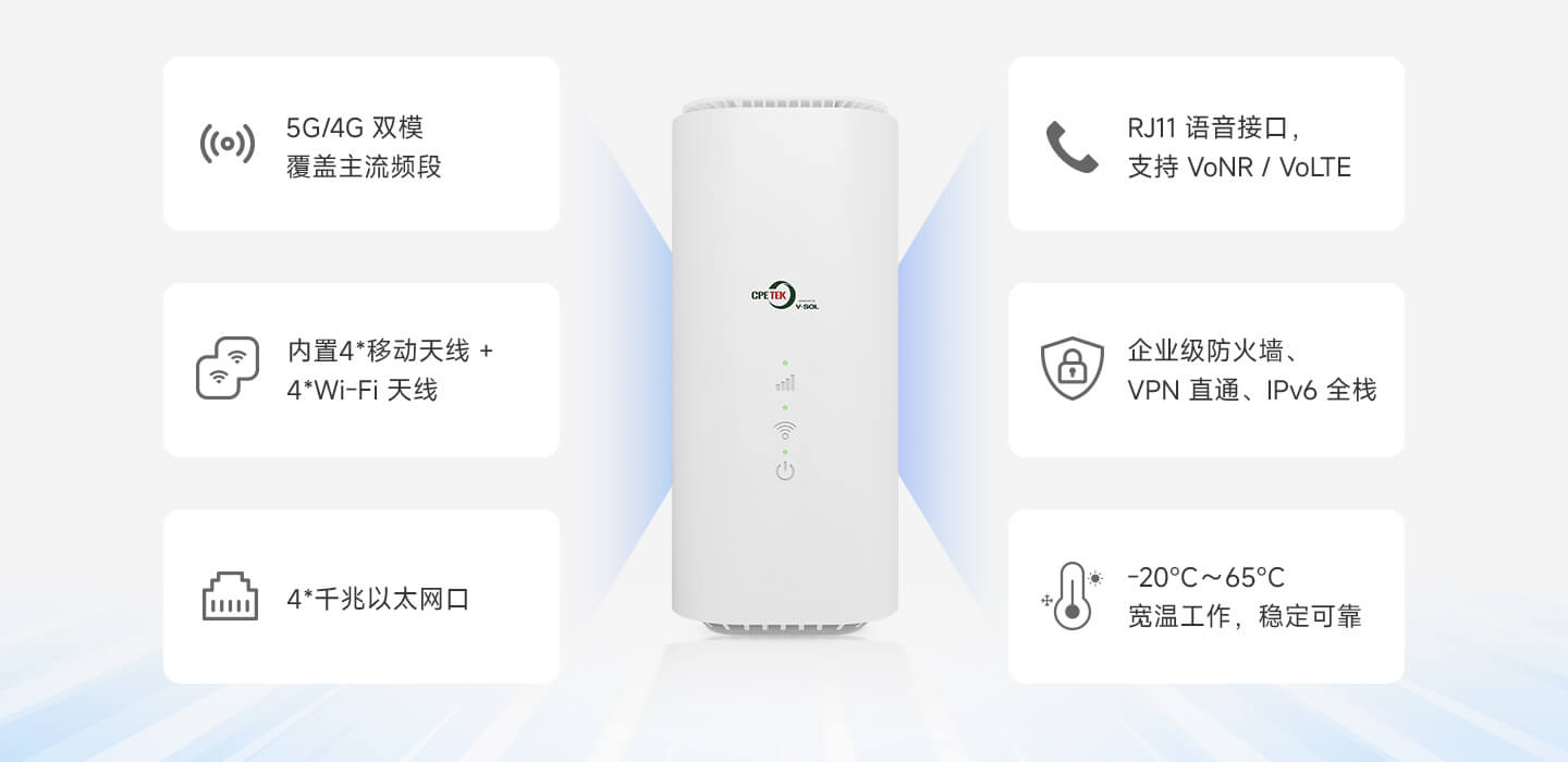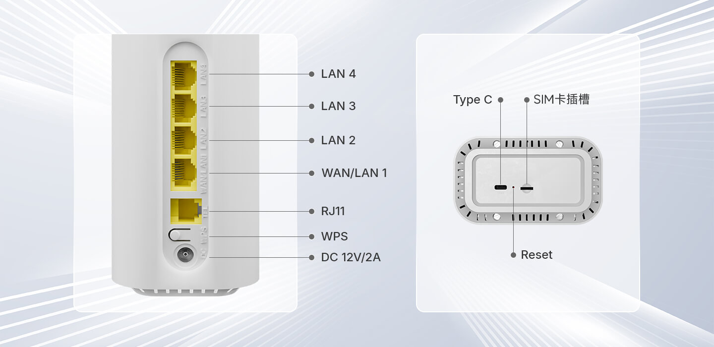 3GE*LAN口+ 1*GE WAN/LAN,1×Type C I/F端口,1×RJ11端口,1× SIM 卡插槽(4FF nano), 1×DC 电源(12V/2A) |