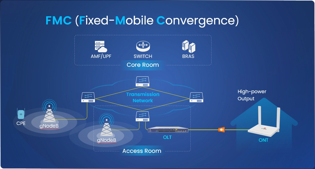 与给每个村庄、家庭或办公场所逐一铺设光纤不同,FMC通过就近基站部署接入能力,将宽带服务通过驻基站的OLT投放至周边社区和用户。这种方式能够:
